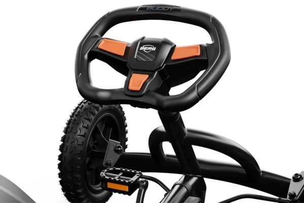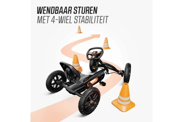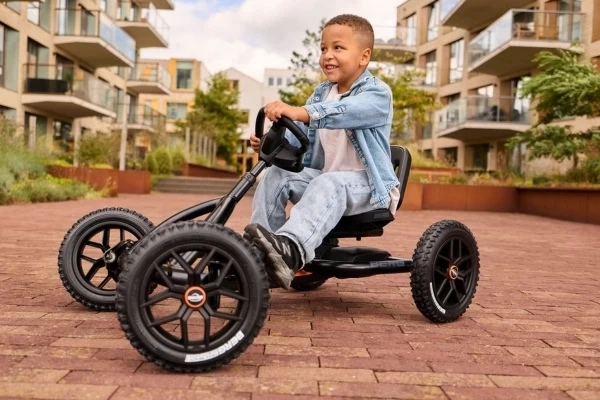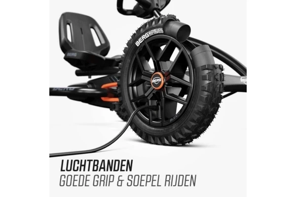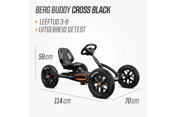 Ga op avontuur met de robuuste zwarte Buddy Cross Black! De go-cart is voor stoere kinderen vanaf 3 jaar. Dankzij de verstelbare stoel groeit deze mee met een lichaamslengte van 100 tot 130 cm, zodat uw kind er jarenlang plezier van heeft. De vier luchtbanden en de schommelas zorgen voor extra stabiliteit en comfort, ook op oneffen terrein. Met het slimme BFR-systeem kan de bestuurder trappen, remmen en direct achteruit rijden. Optioneel: breid de go-cart uit met een leuke accessoire, zoals een aanhanger.