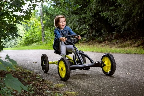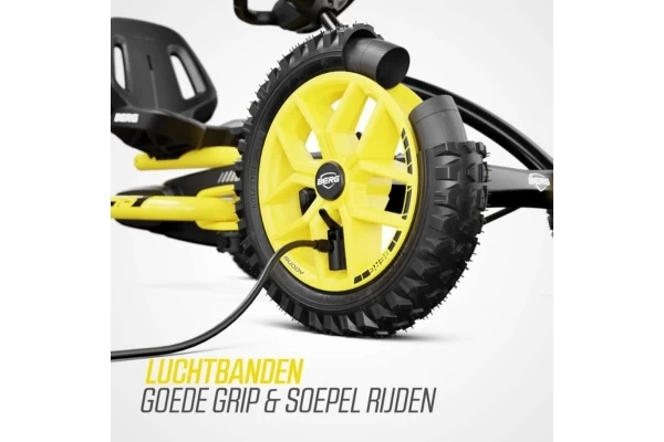 Skelter met soundbox! Met deze stoere Buddy Cross go-cart van BERG crosst u door alle bossen en paden. De go-cart beschikt over speciale off-road banden zodat u gemakkelijk kunt scheuren door modder en zand. Om het evenwicht te bewaren heeft de go-cart een schommel-as. Dankzij de luchtbanden en het feit dat u de stoel kunt verstellen zit u altijd comfortabel op deze BERG Buddy Cross. Voor kinderen met een lengte van 100 tot 130 cm. Optioneel mee te bestellen: spoiler met naam.